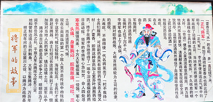 面對即將戰敗,大明百姓將輪為土司的奴隸,李將軍也染上了疾病,發(fā)病時(shí)上吐下瀉不止。當藥師送藥給將軍服用時(shí),由于藥實(shí)在太難吃,他服完藥后馬上抓過(guò)身邊的酒一飲而盡,沒(méi)想到這酒居然增快了血液循環(huán)使藥性在他體內揮發(fā)得更快。清晨醒來(lái)發(fā)現病癥全消,大呼:“奇跡”便命人拿酒混著(zhù)草藥服用,藥力隨著(zhù)酒精在士兵們體內很快的發(fā)揮,不久病愈的明軍戰勝了邊境的土司。當地老百姓便送明軍一個(gè)稱(chēng)號——“正氣軍”,李將軍便是這正氣軍中的“正氣將軍”,而加了酒精的藿香水也因此得了“藿香正氣水”的名稱(chēng),并一直延續下來(lái)。